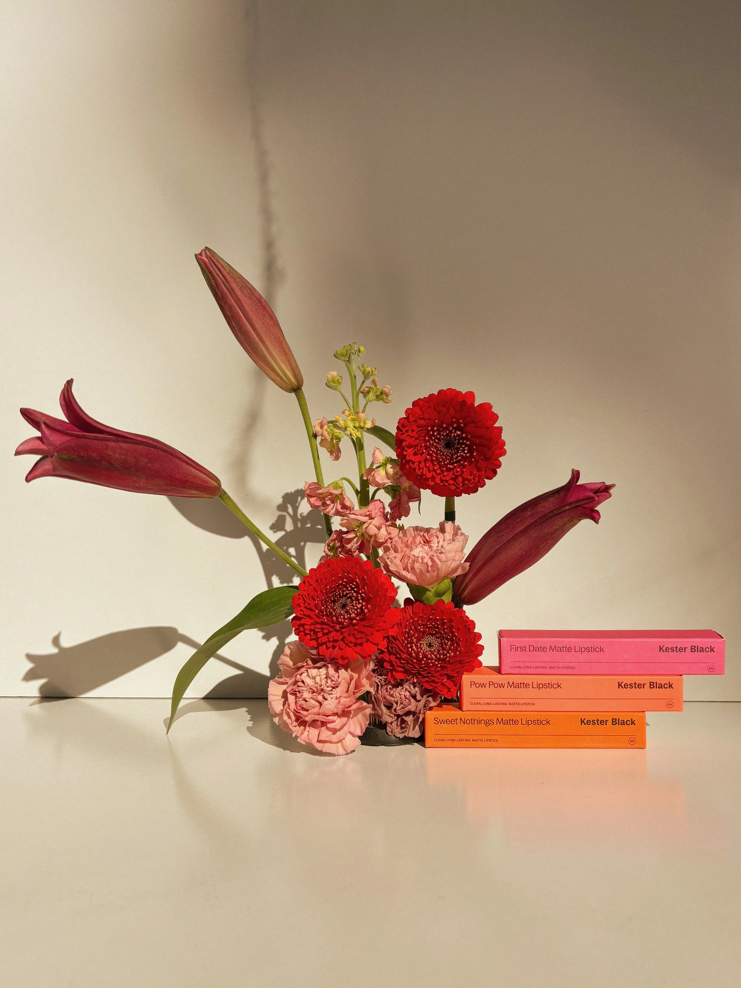 After posting some styled photos of some of Kester Black’s nail products with one of my favourite floral sets, the brand reached out to send me some of their Matte Lipsticks and a balm cleanser to photograph. Since I was having a real floral moment, I chose to match blooms with the shades they generously sent me. Some of the final shots were then turned into a short reel for socials.