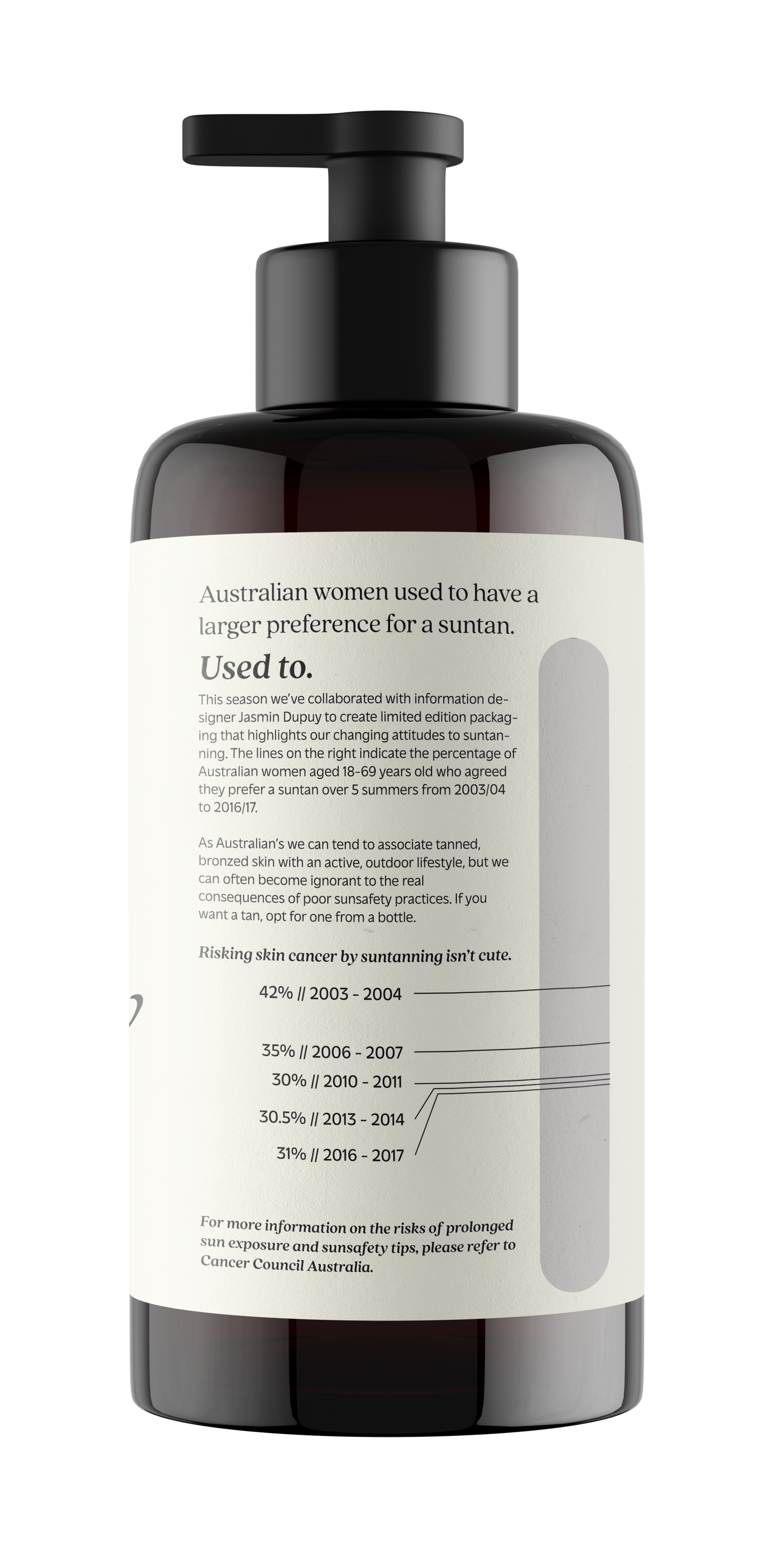 Created data visualisations in the form of digital product packaging mock ups and physical forms to represent the prevalence of melanoma diagnosis in Australian women and their attitudes towards tanning.